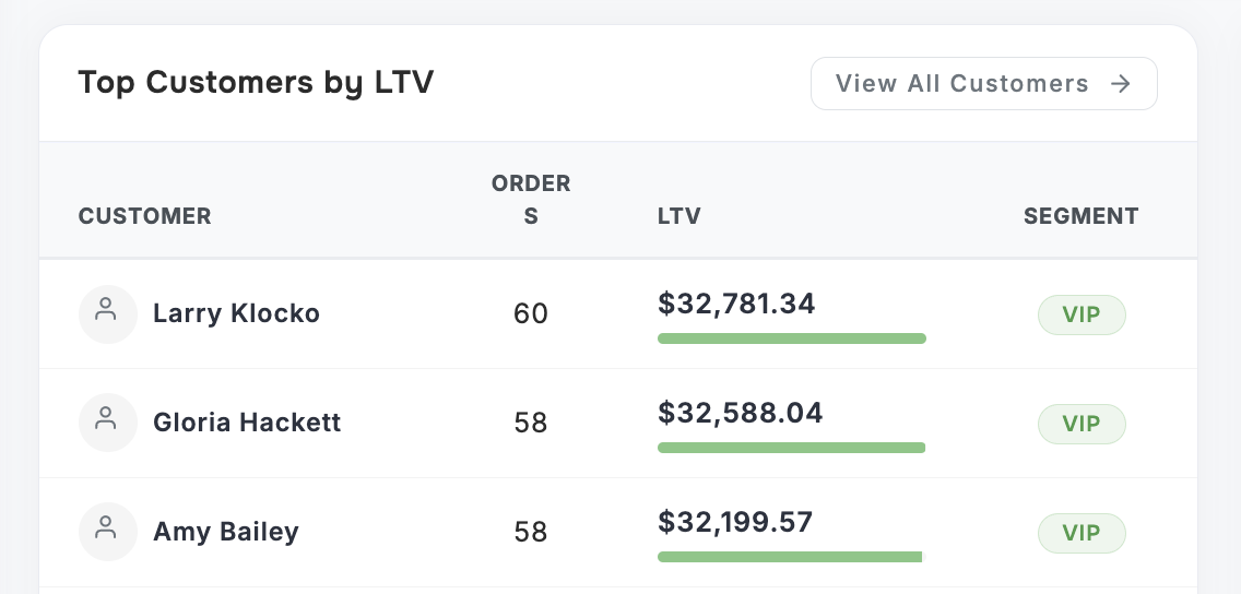 Understand Your Customers’ True Value. Identify your top customers with clear LTV insights. Segment your audience, track orders, and uncover opportunities to boost repeat purchases and revenue.